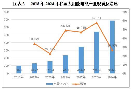 近年来,得益于我国鼓励发展新能源的优惠政策,太阳能电池片产量增长势头良好。根据国家统计局数据,2023年,我国太阳能电池(光伏电池)产量为541.2GW,同比增长57.51%。2024年产量增至685GW。