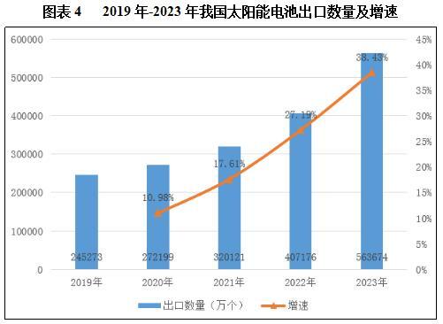 近几年,我国太阳能电池出口量呈快速增长趋势。据中商产业研究院数据库显示,2023年中国太阳能电池出口量563674万个,同比增长38.43%。最新数据显示,2024年1-2月中国太阳能电池出口量128881万个,同比增长32.9%。
