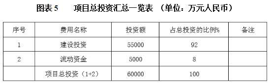 项目总投资为60000万元,其中建设投资55000万元,流动资金5000万元。