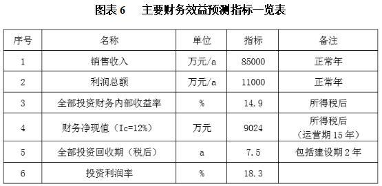 项目达产后,年销售收入85000万元,利润11000万元,投资回收期7.5年(税后,含建设期2年),投资利润率18.3%。