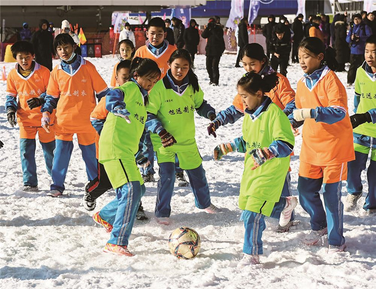 由小学生们组成的雪地足球队,为大家上演了一场精彩的雪地足球比赛。