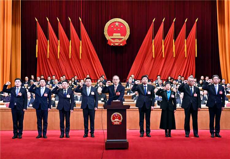 当选的省十四届人大常委会主任、副主任、秘书长、委员和被任命的省十四届人大环境与资源保护委员会主任委员进行宪法宣誓。张野 摄
