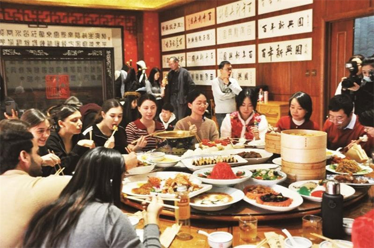 外国留学生兴致勃勃地品尝中国东北版的年夜饭。