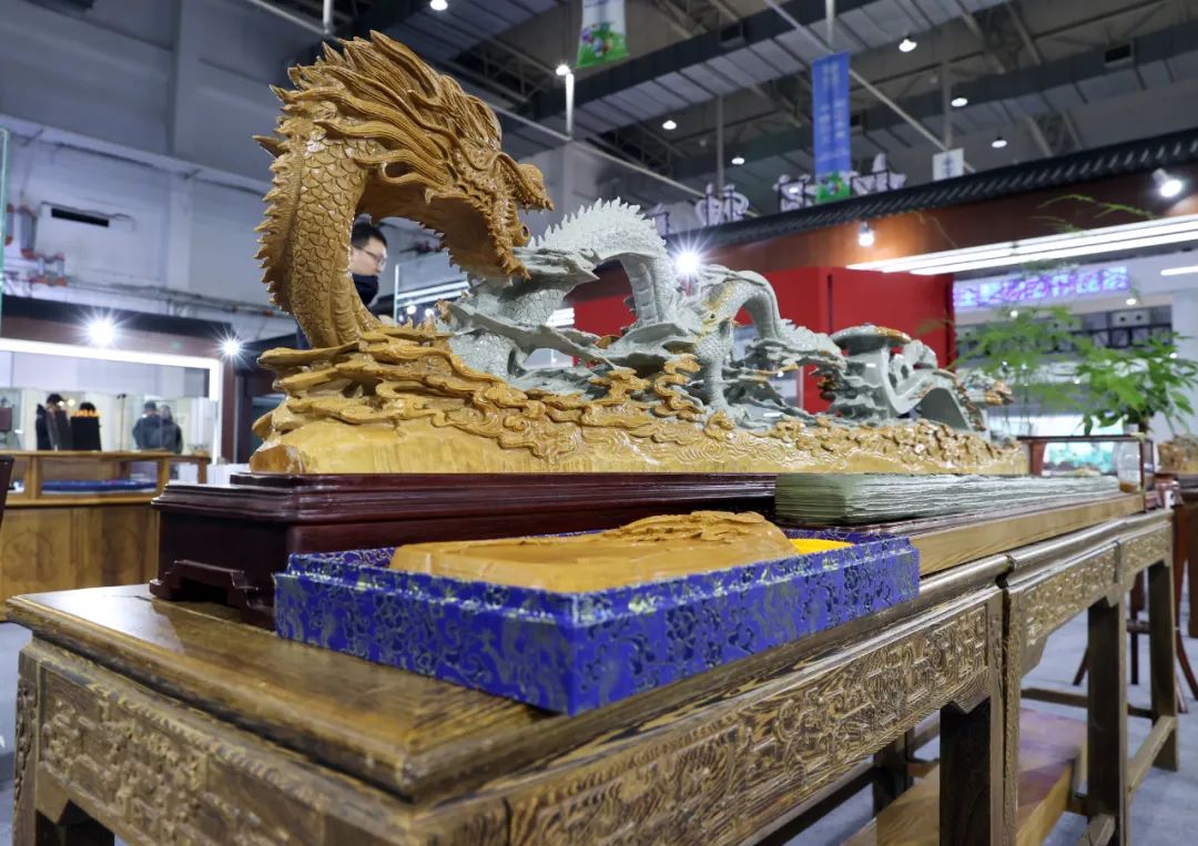 第二届东北书博会主会场文产非遗展馆“松花神韵”展区中的松花石工艺品。吉林日报 丁研 摄