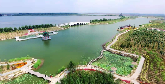 人工景观空间布局应与生态环境相契合,大安嫩江湾国家湿地公园利用多样的人工景观营造出与自然相融合的生态风景,最大限度地保持了古老渡口和江湾湿地的原有风貌,观江码头、听涛阁等人文景观与翠谷溪、玉龙湖等自然景观和谐共舞,营造出洲陆相依、人水相亲的休闲空间,仿苏州园林似的建筑,仿佛置身于江南水乡,不是江南胜江南。