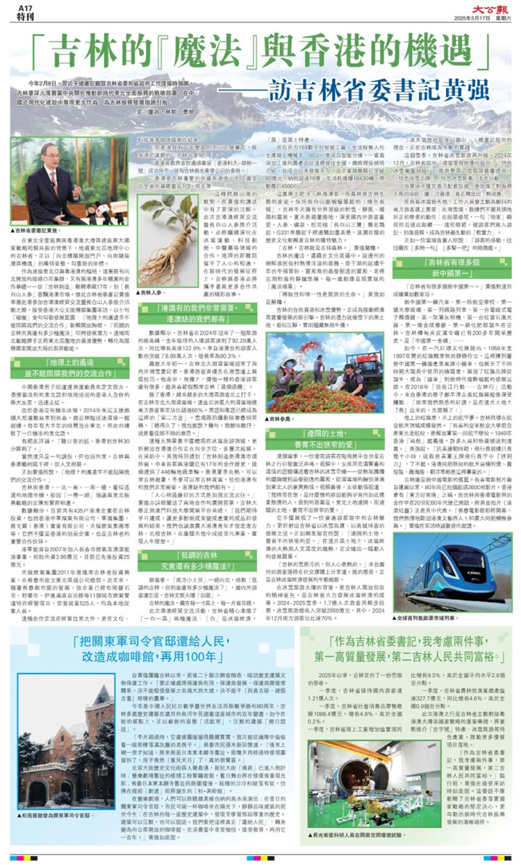 作为连接东北亚与粤港澳的枢纽,这里既有向北开放的陆路口岸集群,又有与港澳多年积淀的合作基础——从“吉林制造”驰骋港铁17年,到“长白山人参”香飘港澳市场。值此吉林省委书记黄强率团赴港参加吉港澳经贸交流暨长白山人参推介活动之际,接受香港大公文汇传媒集团采访,以七句“破圈”金句勾勒发展蓝图:“地理上的遥远并不能阻隔我们的交流合作”彰显开放胸襟,“低调的吉林究竟还有多少种魔法”叩问发展潜力。这场南北战略握手正将东北亚腹地的资源优势,转化为服务国家开放大局的澎湃动能。